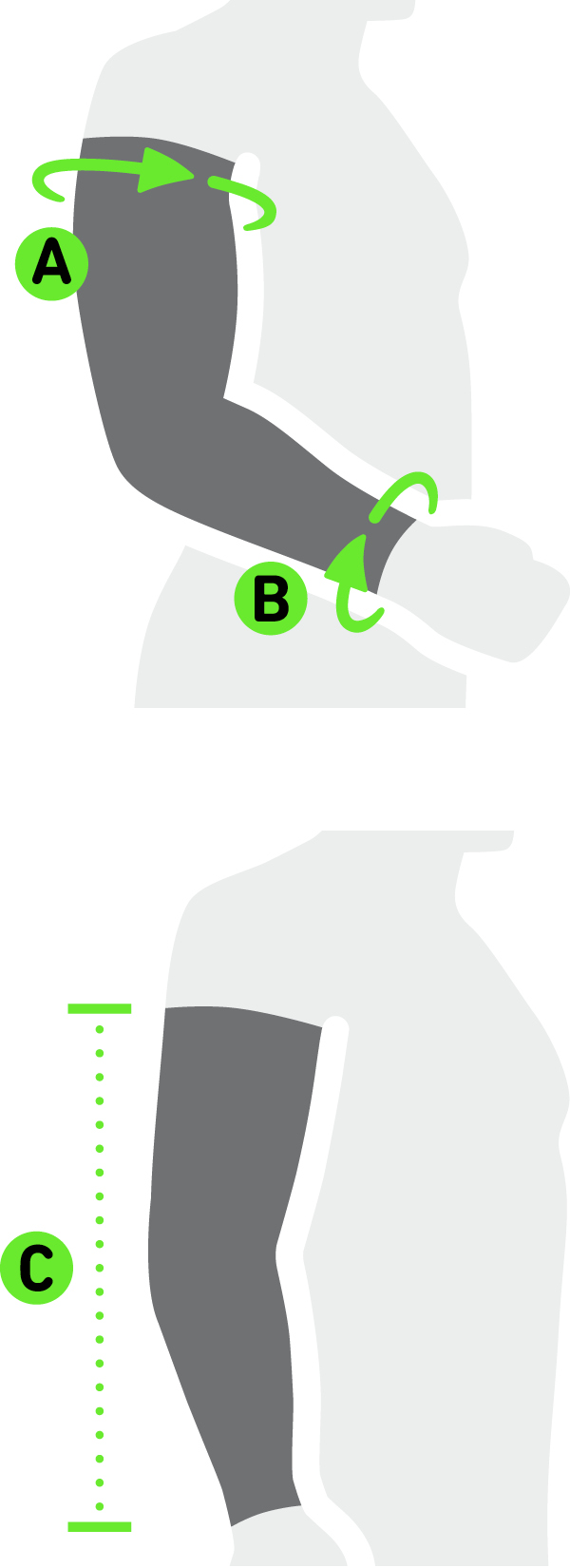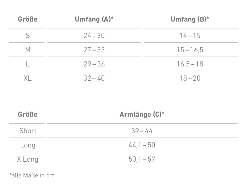 Für die Auswahl der richtigen Größe sind der Umfang am Handgelenk, der Umfang am Oberarm in Höhe des Achselbereiches sowie die Armlänge vom Handgelenk bis zur Achselhöhle zu bestimmen.